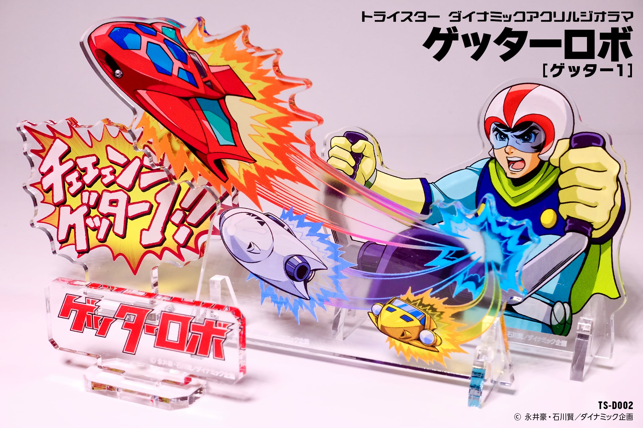 「チェェェンジ ゲッター1!!」の叫びとともに、3機のゲットマシンが合体!ゲッターロボのダイナミックな合体シーンを、美麗な印刷と立体構成で表現したアクリルジオラマです。
